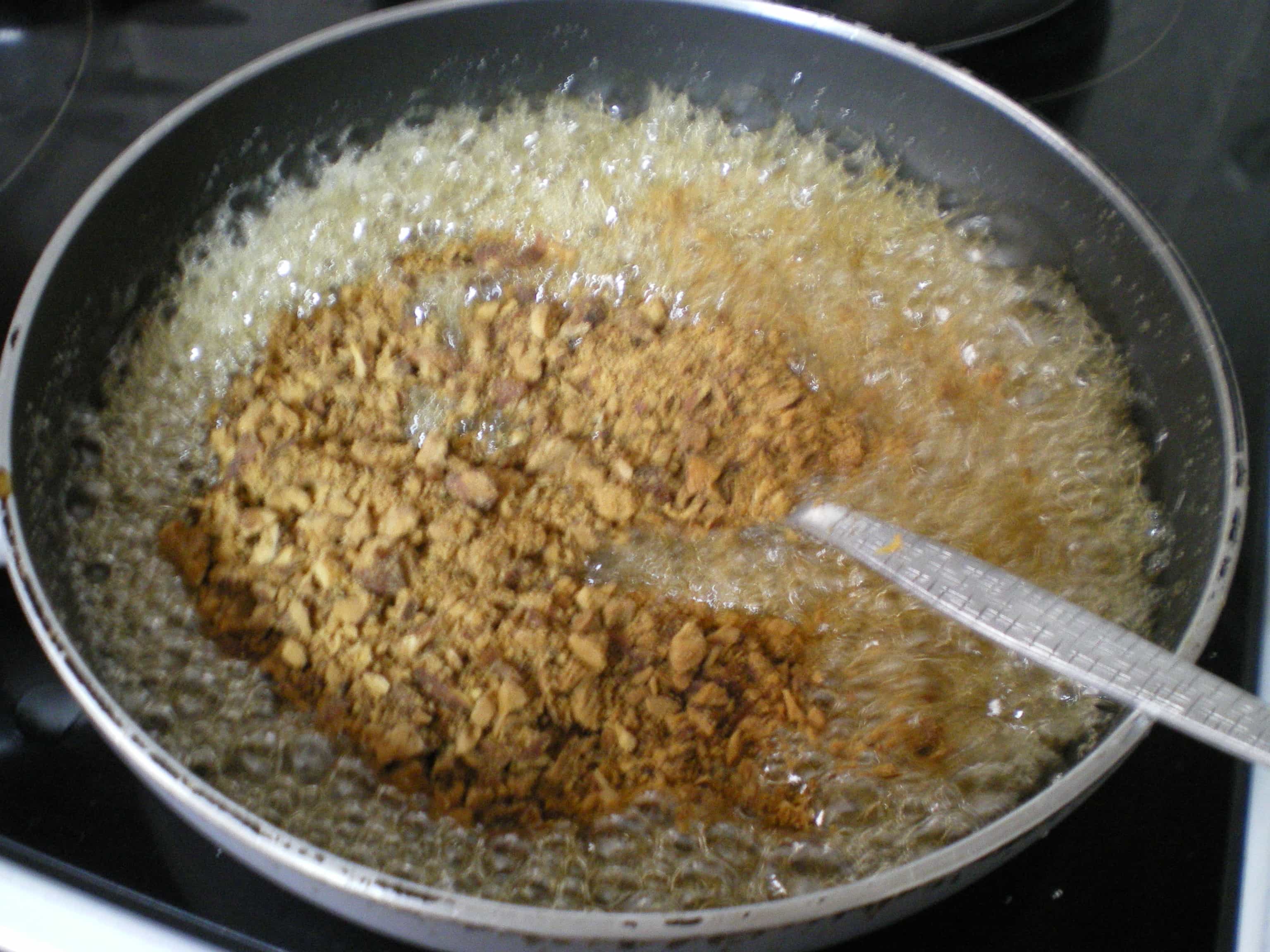 Place sugar, lemon juice and water in a small pan or frying pan and stir until browned.