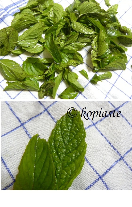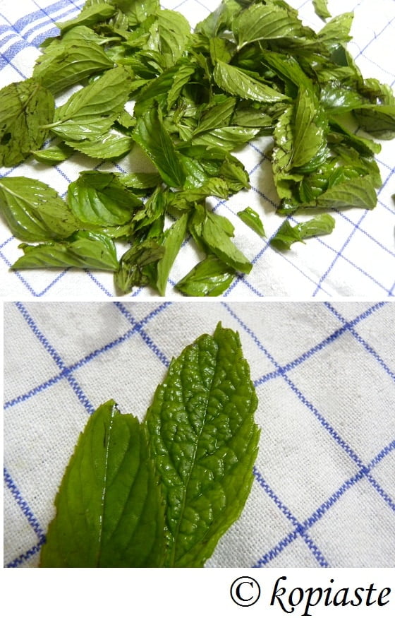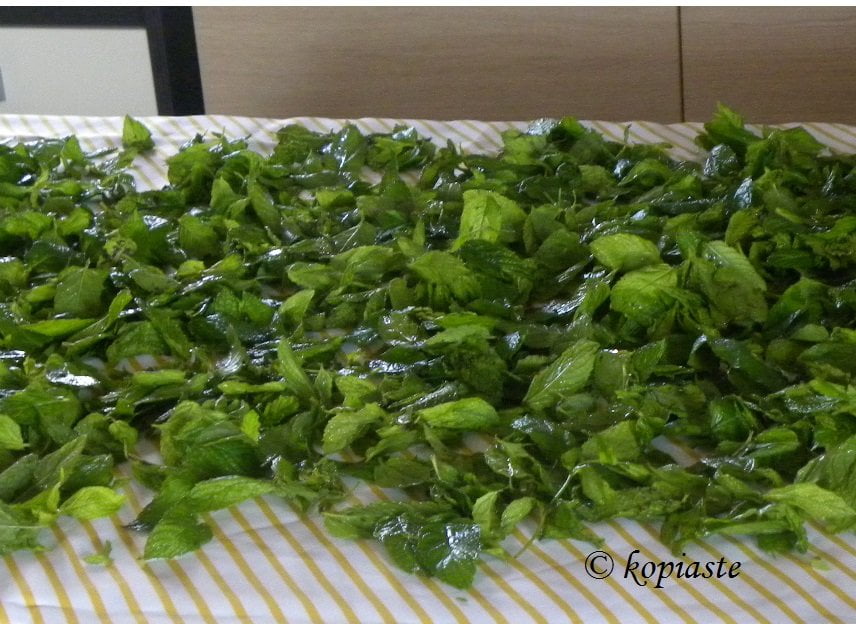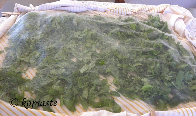 After draining, place them on a cotton napkin or on a table cloth. If you live in the countryside and there are flies, cover the mint leaves with tulle. Opening windows and doors to make a draft during hot weather may blow the leaves away. So for protection against insects or wind, cover it on top and secure the tablecloth and tulle with safety pins or even pegs.