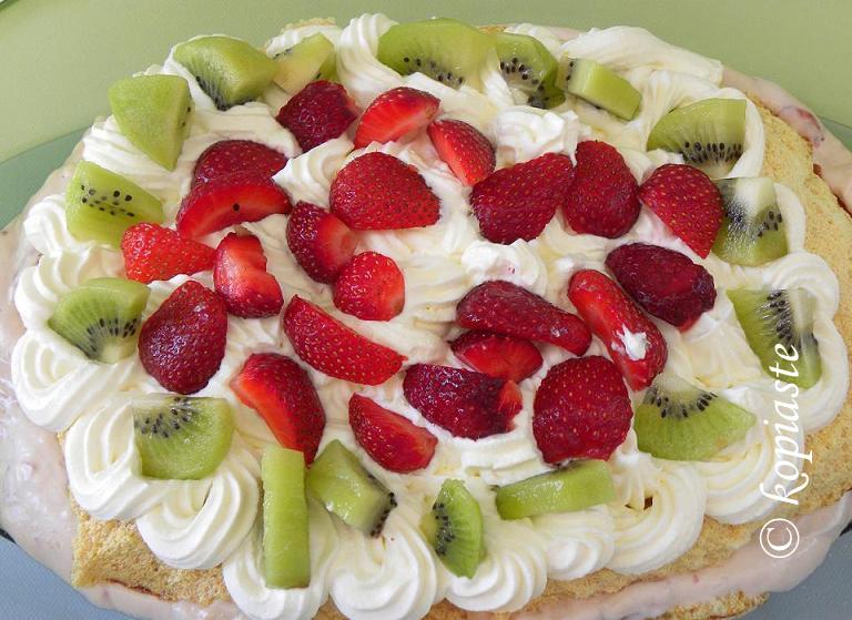 When I received the package my sister was visiting me from Cyprus so one nightI invited some friends for diner and decided to make Pavlova. I had never made a meringue cake before as my old mixer would not beat the eggs properly and part of the egg white would remain just as I put them in. However, as it was the first time I made it I was really afraid that it might not turn out very good, so just in case I had a back up dessert as well.Needless to say that they were all thrilled when they tasted it.“So light and tasteful”, as they told me.They all asked for the recipe. This cake may resemble in appearance to my Torte Fragole but believe me it is the most decadent cake I ever tasted.