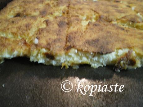 This pita can be made like tyropita by using either home made phyllo or store bought. In each case, each phyllo 5 – 6 layers, should be brushed with butter, then the filling is added and another layer of 4 – 5 buttered phyllos and baked until golden brown.