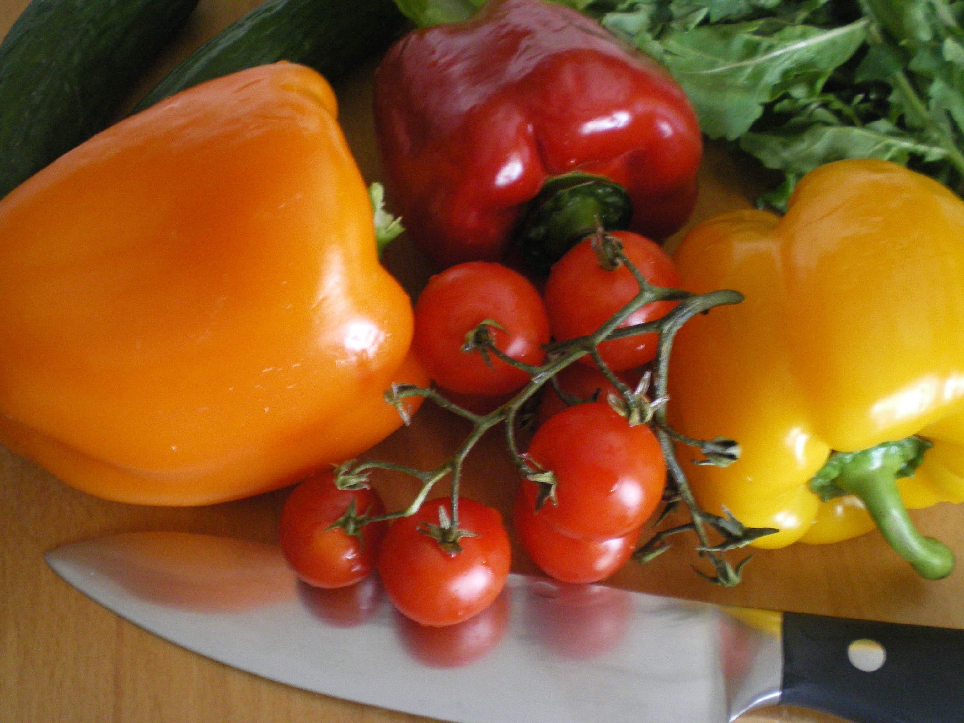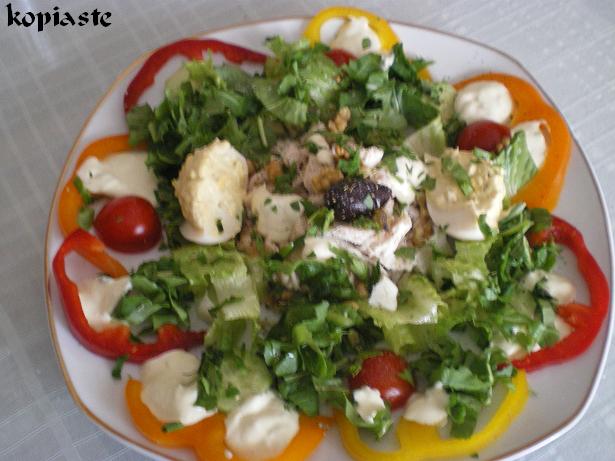 Boil chicken breast and cut into small pieces. (Reserve broth for other recipes). Wash and slice the peppers, coarsely cut the lettuce and rockets, halve the cherry tomatoes, slice the cucumber, finely chop the parsley, quarter the eggs (I used some of the Easter eggs and still have some), pit the olives and crush the walnuts.Add, salt, pepper, oregano and dressing.