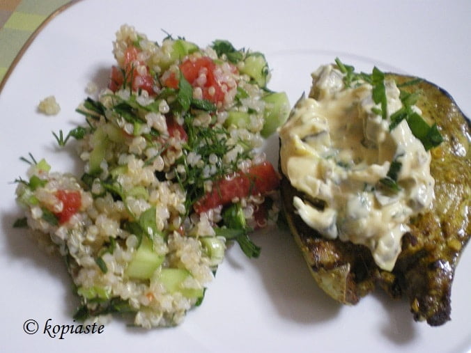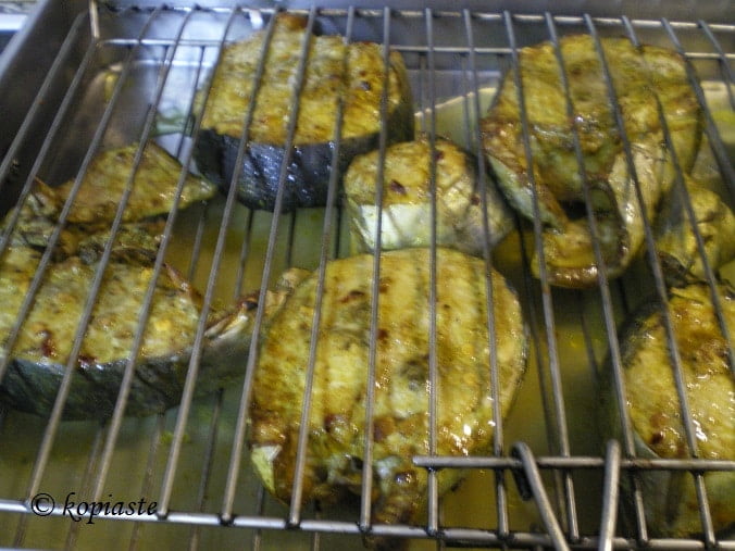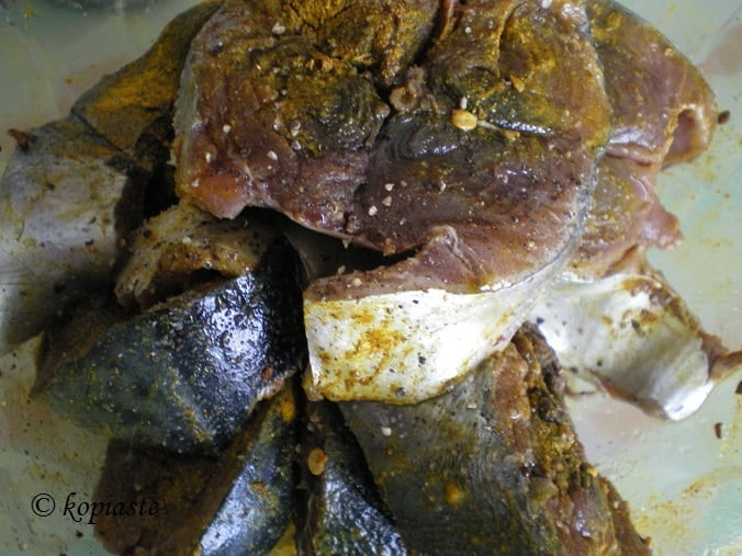 This tuna fish has rather dark flesh and apart from the back bone the rest is boneless. I wanted to make a tasty and healthy dish, so I marinated it and grilled it and served it with quinoa salad and tartare sauce.