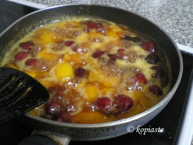I pitted the cherries and apricots (about 2 cups), added 1/2 cup sugar and 1/4 cup water, a small piece of cinnamon stick and cooked them in a non stick frying pan for five minutes, to make a fruit  sauce.