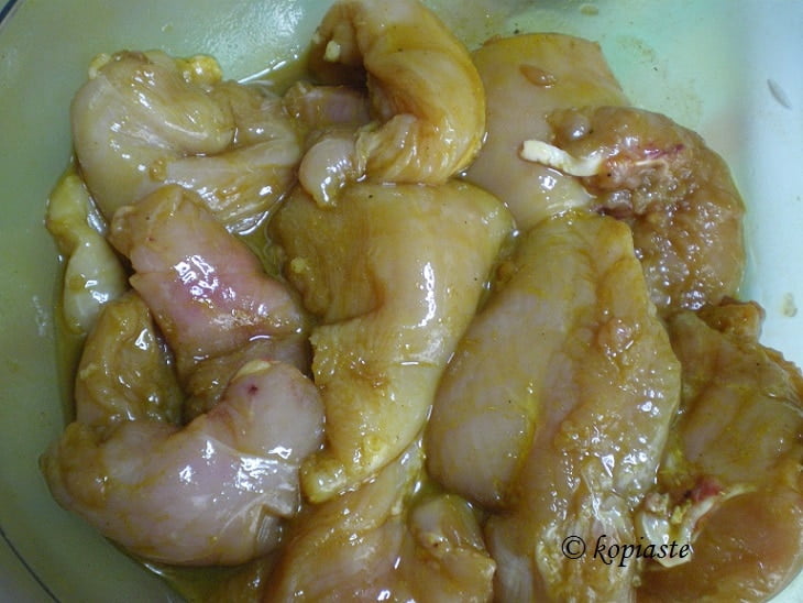 - Cut chicken breasts in smaller pieces and place in a bowl, together with all ingredients and let them marinate for 2 – 3 hours or even more. I prepared it early in the morning.