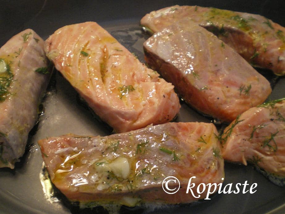 4. Heat olive oil in a sauteing pan, remove dill and saute on both sides, adding all juices from the marinade.