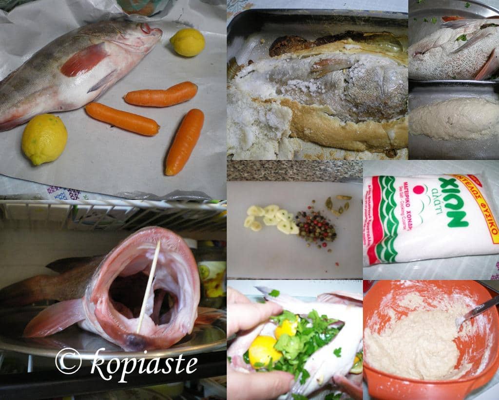 I saw this recipe more than a year ago, before I began blogging at Elias Mamalakis’ T.V. show and I could not remember exactly what ingredients he used but I found the recipe on his site.As I often say, I cannot stick to recipes and whilst he made it with sea bass and filled the fish with mushrooms, garlic, parsley and peppercorns, I chose to add lemon slices as well and added my favourite spice cardamom. Since I found this spice I have been addicted to it and could not resist adding it as well. Mamalakis used only salt to cover the fish but as I had only one packet of salt and discovered half way that it was not enough to cover the fish, I added two egg whites and some flour and remaining salt and made a salt batter to cover it.Instead of pouring butter on the vegetables as he did, I made a ladolemono sauce with oregano.