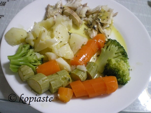 7. Serve in a platter with the steamed vegetables and serve with the ladolemono dressing.