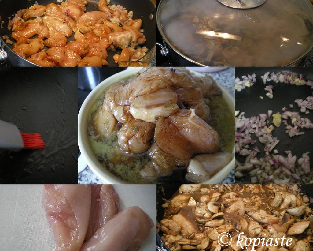 Wash and dry chicken breasts and cut into 1 cm pieces. Marinate the chicken for at least three hours in the refrigerator.