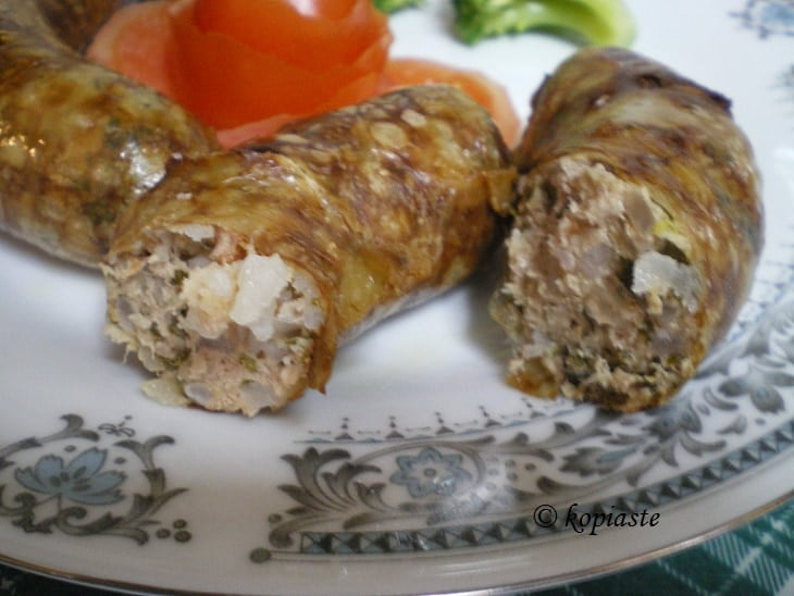 The pork intestine is thoroughly washed and filled with a mixture of ground meat, rice, herbs and spices and then it is cooked.