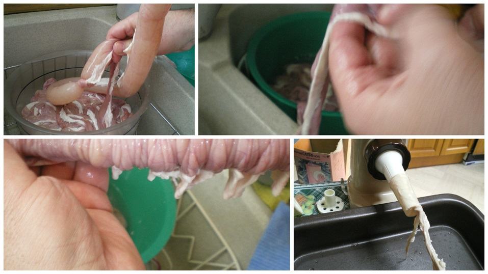 - Fill the intestine with water, so that it runs out like a long sausage. The fatty outside is now in.