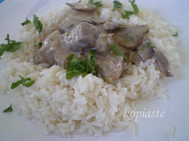Beef Stroganoff is a classic Russian recipe from the 19th century where beef is sautéed and then cooked in sour cream.  This recipe has passed the boundaries of Russia and is popular in other countries as well, with a few variations to suit with the flavours of each country.  After reading a few recipes on the internet I  liked this one best but I decided to make my own changes, to suit our taste.   First of all I used red wine, instead of white wine and used olive oil instead of butter. I added garlic and fresh rosemary, I did not use beef broth and finally, as there is no sour cream in Greece, I added Greek strained yoghurt. I also changed the cooking method as well because in my family they don’t all like mushrooms, so I had to make a roux and add it separately to thicken the sauce and I had to sauté the mushrooms separately and add them at the end.