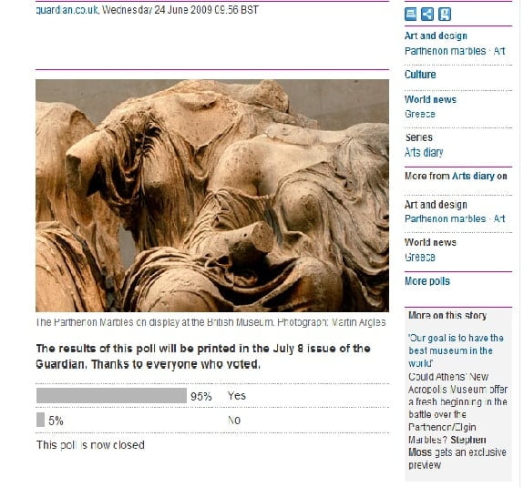 The Guardian had set a voting for the return of the Marbles and the vote showed that 95% were fore their return. The results of the poll will be published on the 8th of July issue of the Guardian.