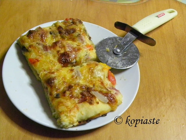 My husband and children don’t fast the whole period but just for a week, so I usually increase the dough dose and make two large baking tins. Two of my children don’t like eating vegetables so I make one with ham or turkey or bacon and lots of cheese on top. Any leftovers disappear in the morning 🙂