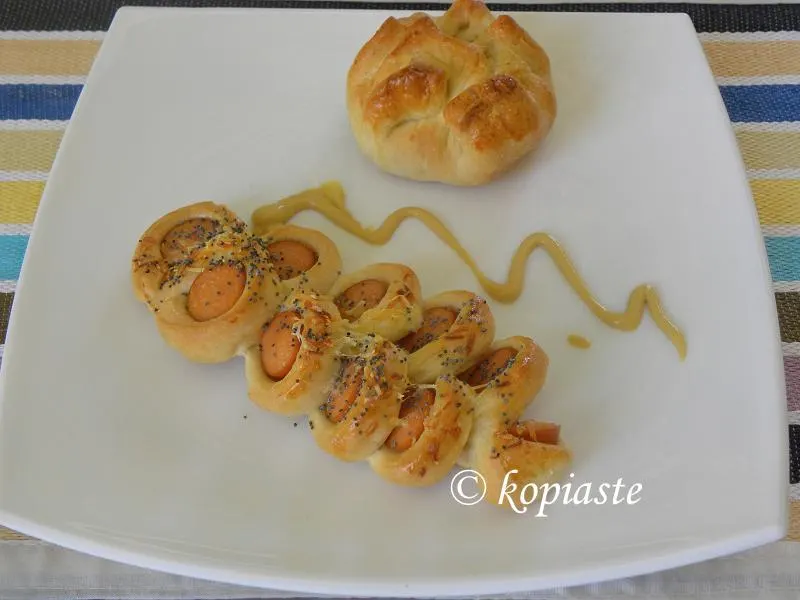 Roll out one big piece of dough. Place the sausage on the dough and cut the dough, just enough to roll the sausage once. Cut it into 1 cm slices but do not cut all the way through. Take the first piece and twist it to the left and the other piece to the right and continue the same with all the pieces. Place them on a baking tin lined with parchment paper and allow to rise. Brush with the egg wash, sprinkle with some cheese and poppy seeds.