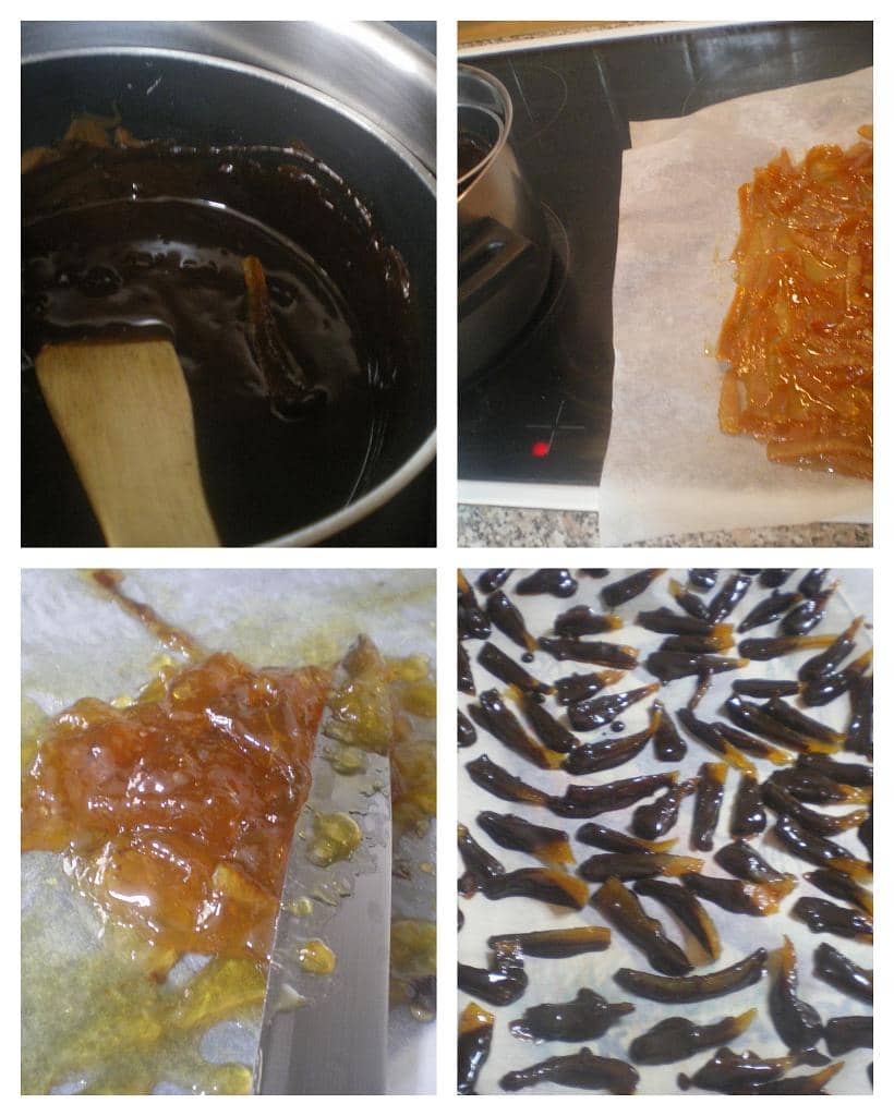 On Monday I made Melomakarona but this recipe will not be posted as this year, I am really disappointed of my melomakarona. I decided to give them a different taste and among other ingredients I used a liqeur which was too strong. I am not giving up on the concept of this recipe which I intend to improve next year. When making melomakarona, I did not throw away the peels but made them into caramelized orange peels. After removing all the pith, I boiled them for half an hour. I turned the heat off and rushed to an appointment I had and when I came back in the afternoon, drained them and added fresh water and boiled them again for half and hour and drained them. I had leftover honey syrup from the melomakarona I made in the morning, so I made good use of that syrup and boiled the peels in the honey syrup, until it reduced to the consistency of caramel which together with pectin of the oranges became like a jelly when it cooled. I put them on parchment paper with the caramel syrup and yesterday I dipped them in chocolate.