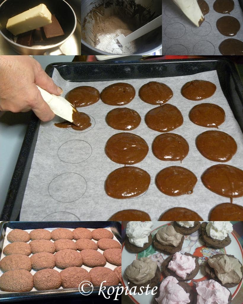 I read at Wikipedia that these started from the Amish community, which they made out of leftovers (and I like making things out of leftovers!!). Woopie pies are not hard like cookies but the biscuit on top should be soft like a cake. They are large, almost the size of a hamburger and filled with a marshmallows cream or a buttercream. When the Amish husbands found one of these large sandwiched cakes, filled with cream in their lunchboxes they would shout “Whoopee” and I don’t blame them for that.