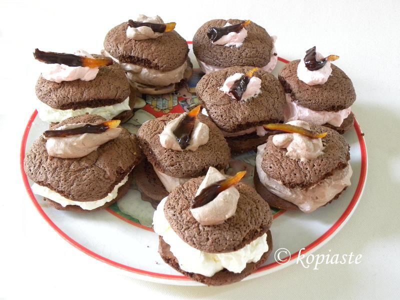 For the filling I did not make a buttercream filling as I am not really fond of buttercream and I don’t like using too much butter in one recipe, so I decided to use the cream cheese filling which we love. When making the chocolate for the orange peels, I added more chocolate than I needed to have some to use in one of the fillings. This gave me the idea to use the leftover orange flavoured caramelized jelly as well. I also made some flavoured with vanilla and to make some pink ones, I used a little of my pomegranate syrup asI don’t like using artificial food colouring. I just scooped some of the filling on the biscuit as I did not have time to use the piping bag and make a better presentation. As a last minute inspiration I added some filling on the top and decorated them with one orange peel et voila!