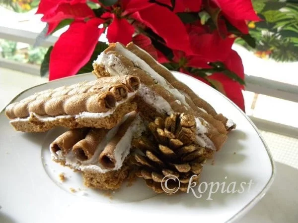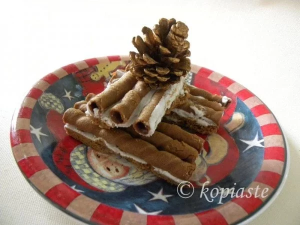 The wafer cigars were intended for the decoration of the gingerbread house and the frosting was ready,  so I cut the biscuit the size of the cigars and spread some sugar frosting to glue them to the biscuit.