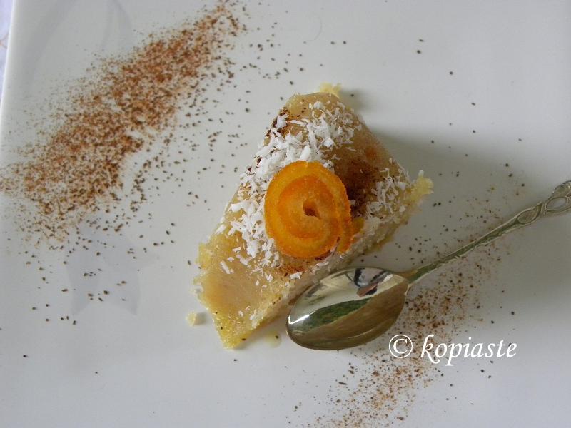 Unmold in a platter and sprinkle with coconut and cinnamon on top and decorate with citrus spoon sweet.