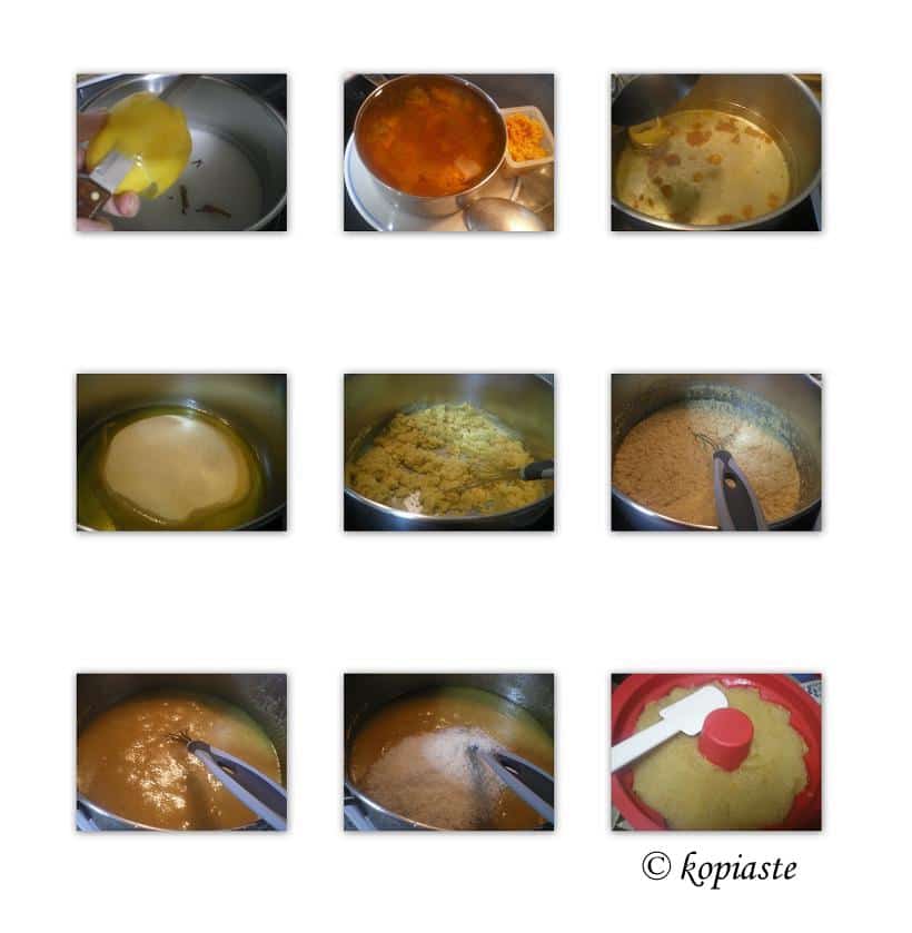 You start by preparinge a sugar syrup and then semolina is browned in olive oil, just like making roux and then both are combined. Pouring hot syrup into hot roasted semolina is a bit tricky, as the syrup needs to be added quickly and it will splatter and even overflow if you are not careful, so if you are not experienced it is better to have someone helping you pour the syrup in the pan.