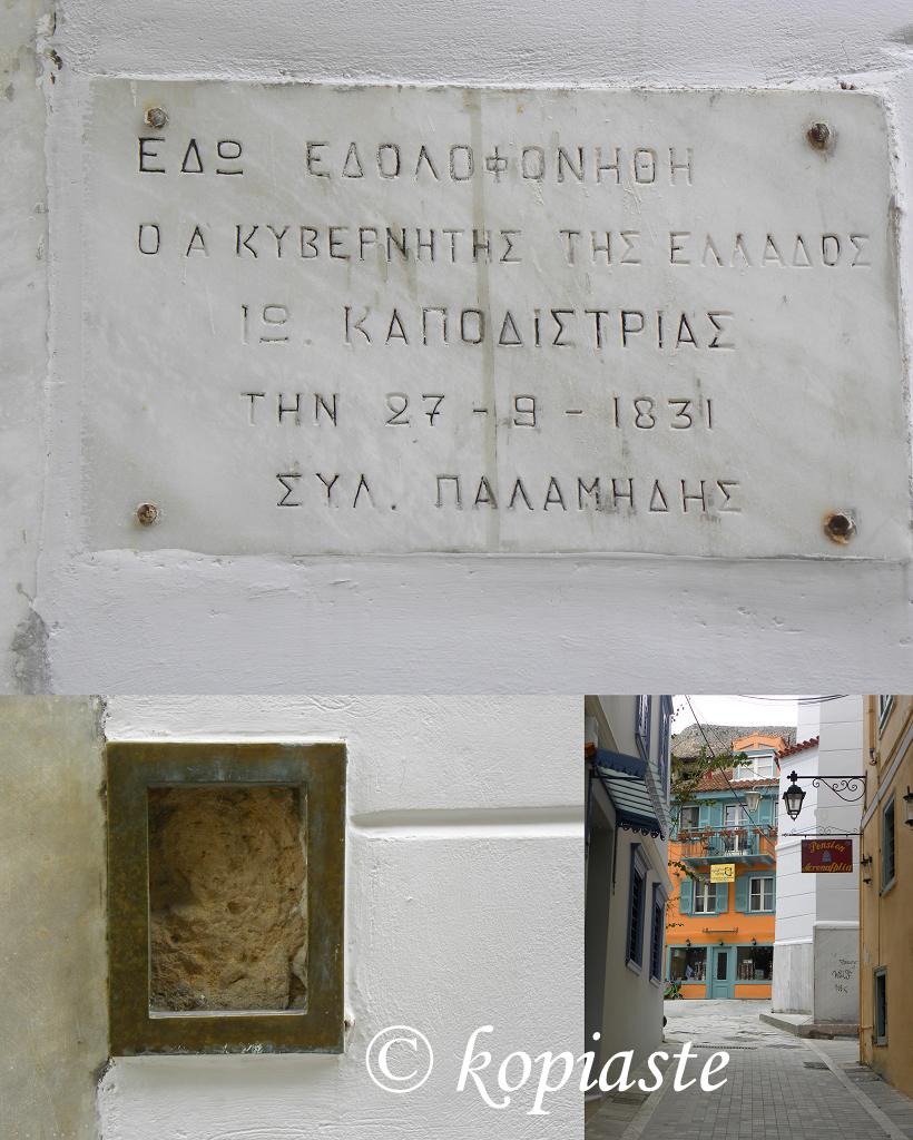 At the end of Staikopoulou Square we reach the church of Agios Spyridonas, where the first governor of Greece, count Ioannis Kapodistrias was assassinated. On the wall of the church is a sign showing the place he was murdered and the hole where the first shot missed him, framed.