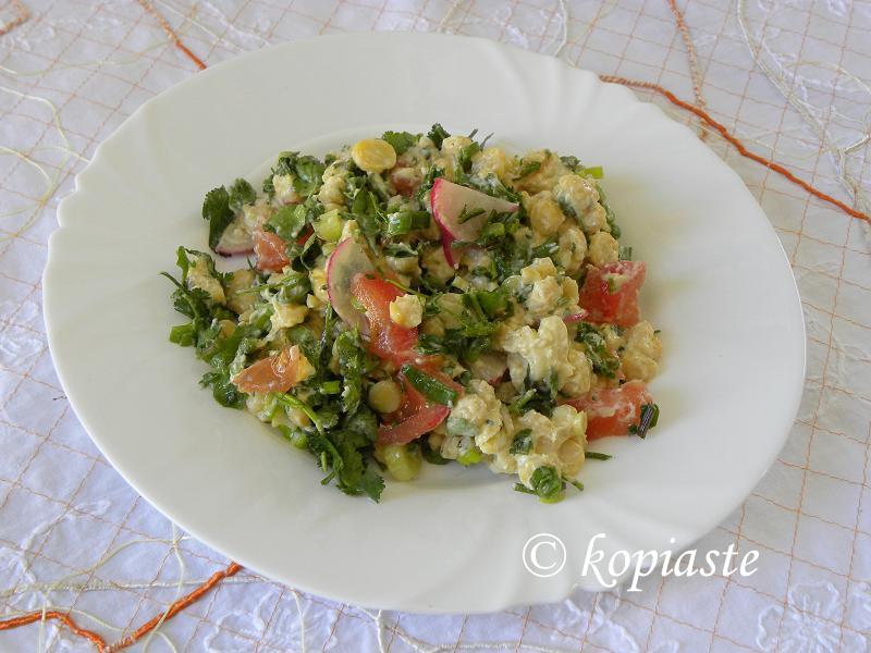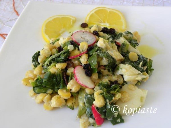 Chickpea Salad with Taramosalata Dressing. This is a salad which is my creatition. I cooked the chickpeas and I added some aromatic herbs and other vegetables and apple but the creative part was to use taramas (fish roe) to make a salad dressing.