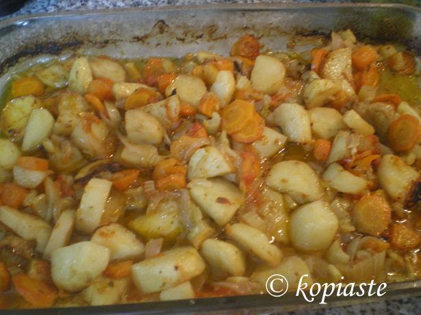 Easy and great tasting, oven baked vegetables provide an enjoyable side dish not only for fish but also for meats or poultry but on itself it is a delicious vegan meal, which can be enriched with courgettes, eggplants etc., depending on the season.