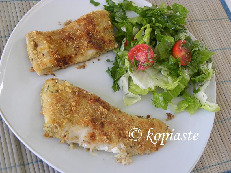 Pecan crusted Lavraki (sea bass) with pesto