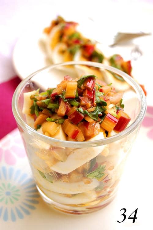Rosa, of Rosa’s Yummy Yums, has made Eggs with Asian Style Galangal and Rhubarb Vinaigrette. Rosa created this recipe with ingredients she had in her pantry, including galangal a rhizome in the family of ginger as well as a rhubarb vinaigrette.