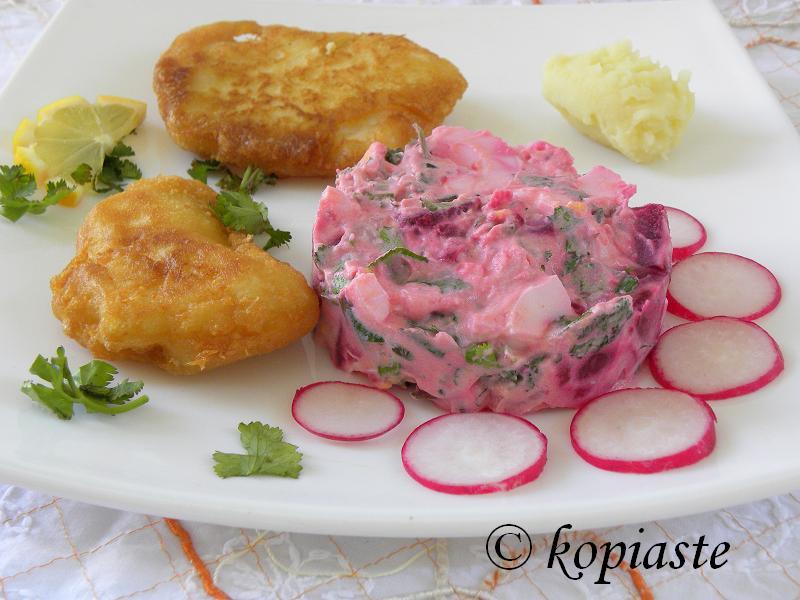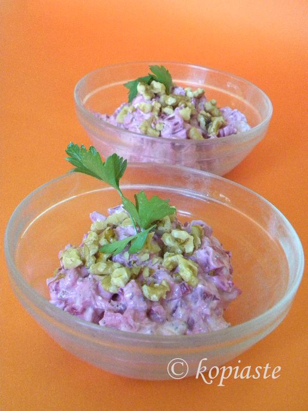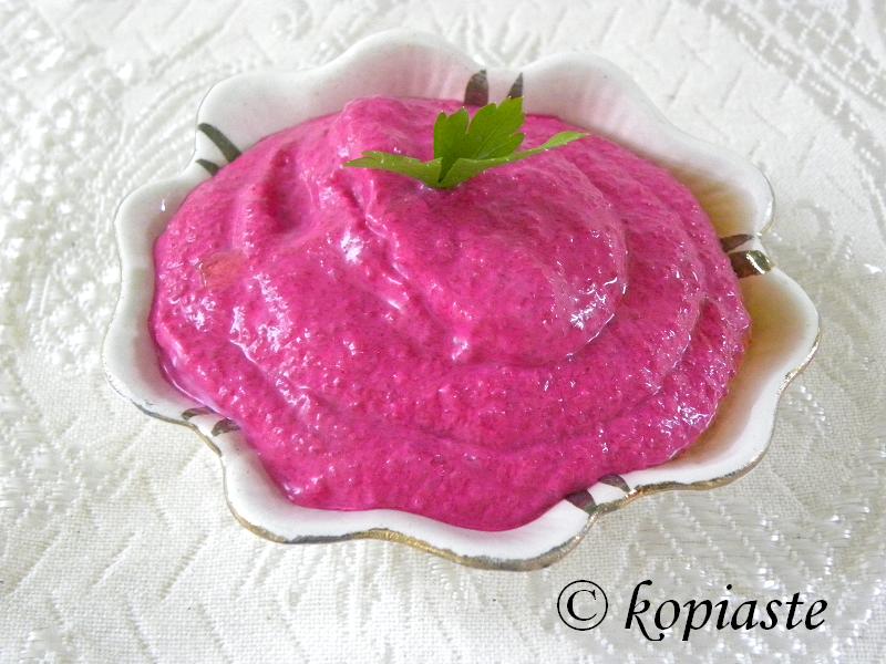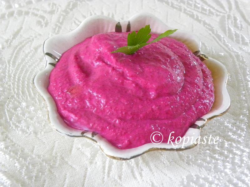Beetroot Salad and Beetroot Dip: Based on a Greek beetroot salad, usually made with boiled beetroots, cut into small cubes, garlic, yoghurt and olive oil I made two different recipes: Beetroot Dip: I made several changes, using preserved beets, which of course have vinegar, added feta, which makes it extra creamy and agourelaio, with its fruity almost bitter taste, which brought this dip to another level. I added all these in a food processor and made it into a dip. The other recipe is the last one.