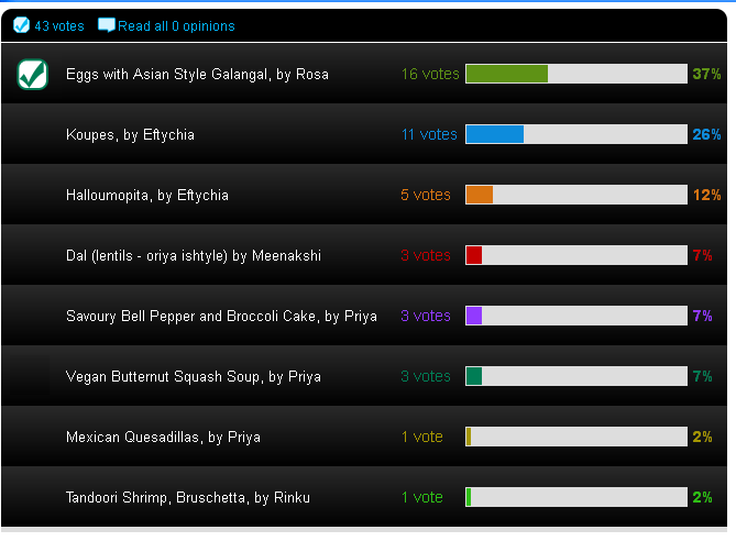 I wish to thank Elais once again for providing the Extra Virgin Olive Oil as well as all of you for participating. Please head over to the side bar for the Voting and vote for the most creative recipe made using olive oil. It may take a few seconds to show the poll, which is just above google translator. The poll will be open for voting for 48 hours starting from now, so you can also tell your friends or readers to vote for you, and the two recipes with the most votes will receive a 1 litre bottle of Greek Extra Virgin Olive Oil.