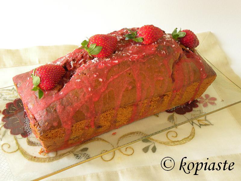 I didn’t like that crack, so what I did was I pureed some strawberries and added icing sugar, lemon zest and lemon juice and made a glaze. I poured it over the crack and let it fall on the sides. Some of this glaze was absorbed by the cake adding more flavour to it. I sprinkled some coconut on top and decorated it with fresh strawberries.