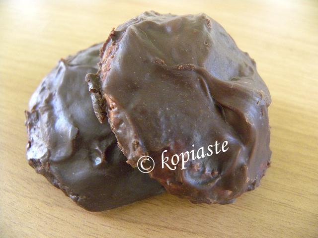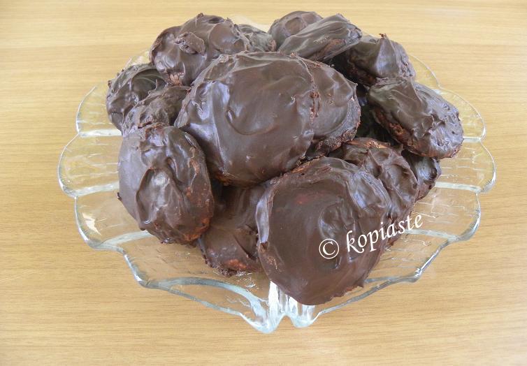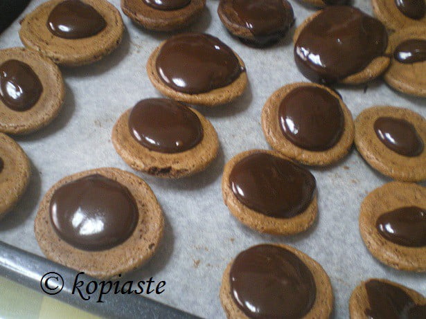 - Transfer them on a tray lined with parchment paper and put the cookies down side facing up. Using a spoon cover them with chocolate and wait until it starts to set.