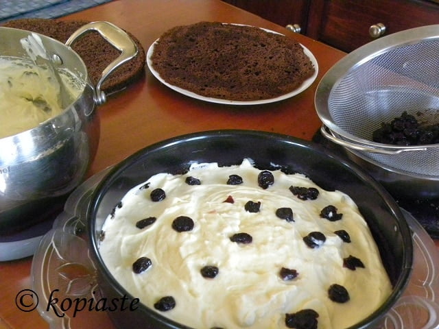 Assemble first layer of sponge cake in a platter, using the spring form ring. If your cake has a dome on top, use the top piece in the middle and end with the last piece, which is flat. Add half of the cream and 1/3 of the sour cherries.