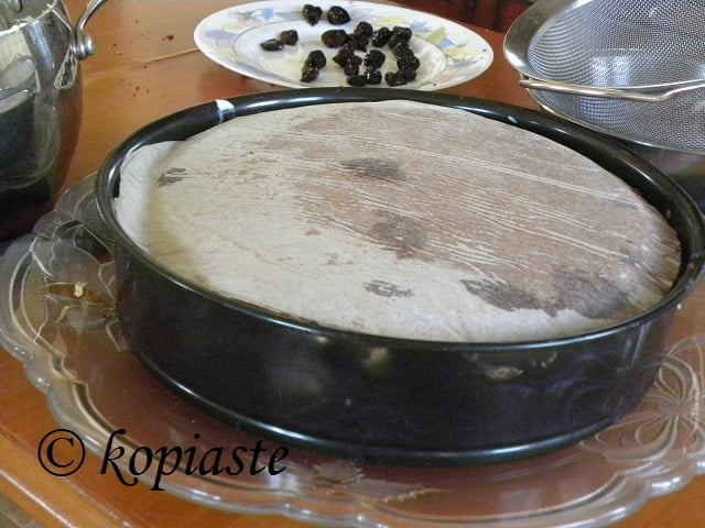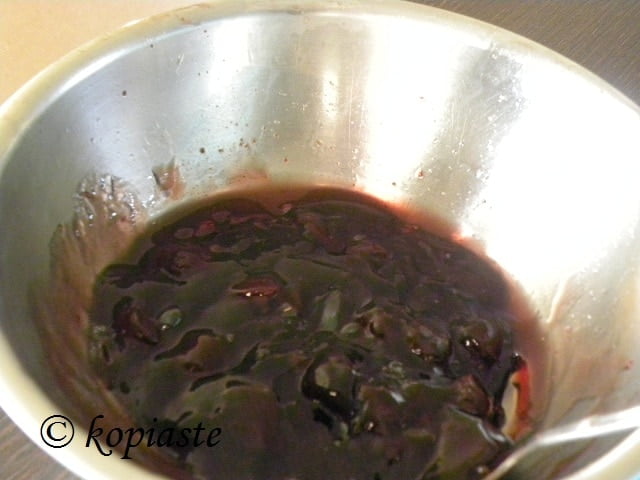 Drain sour cherries. Add half cup water to the syrup and heat the syrup to make it lighter. Wet all three slices of sponge cake.