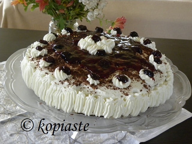 Continue with second layer of sponge, the remaining cream and 1/3 of the sour cherries. Refrigerate for a couple of hours until the cream sets.