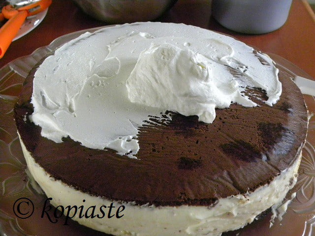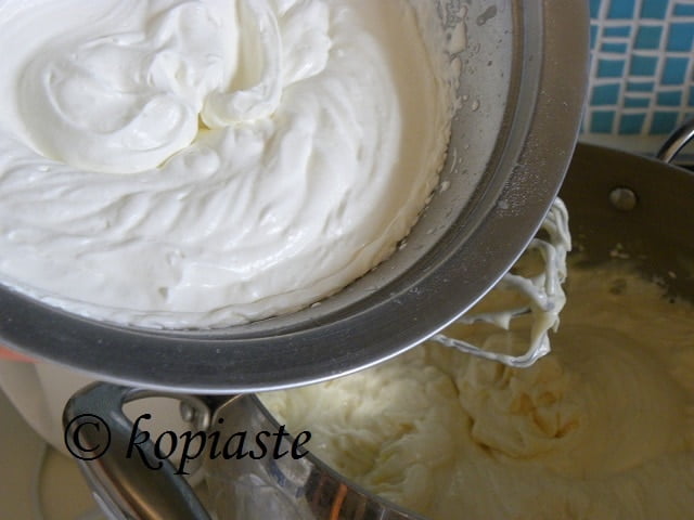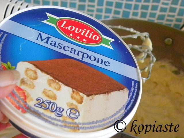 Whisk the pastry cream with 250 grams mascarpone cheese and then mix in 1/3 of whipped cream.