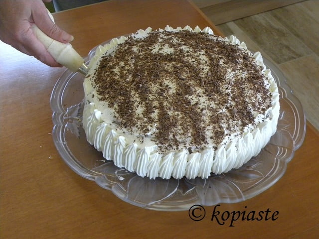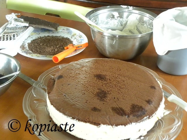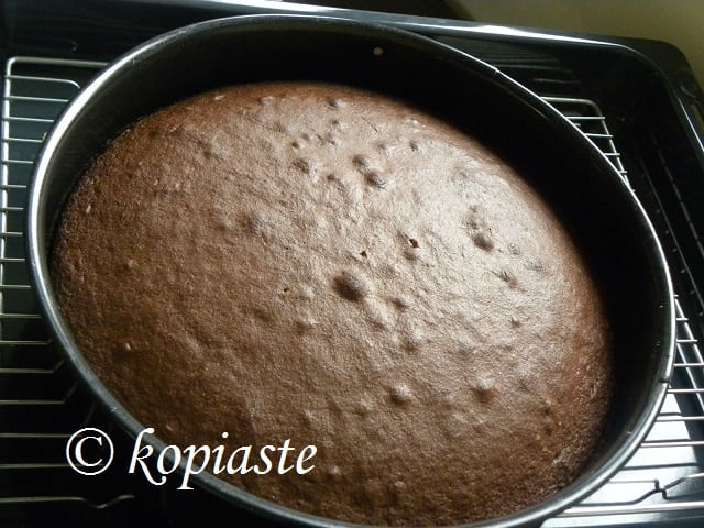 Start by making a basic chocolate sponge cake, preferably from the previous day because it’s easier to cut it into slices. Next day cut it into three slices.