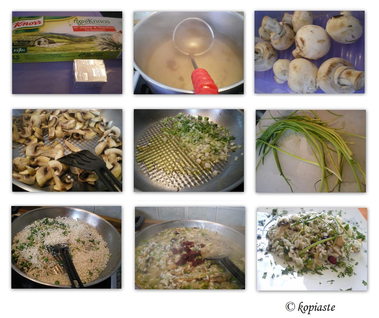 First of all to make risotto we need a special kind of rice, such as arborio, carnaroli, or a variety called vialone nano for more robust flavours.  However, apart from arborio, in Greece it is very difficult to find the two latter varieties and I usually use a very good Greek variety called Carolina, which is a starchy rice.  I have tried arborio and to be frank I prefer the Greek variety which tastes better and is cheaper.