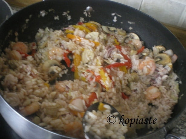 Now is the time to season the rice and start adding the stock a ladleful at a time.  Rice sticks to the bottom of the pan if not stirred often, so we should occasionally (not necessarily continuously) stir the rice and when the stock is absorbed, continue adding a ladleful, mixing from time to time.  This procedure will take about 15 – 20 minutes.