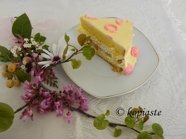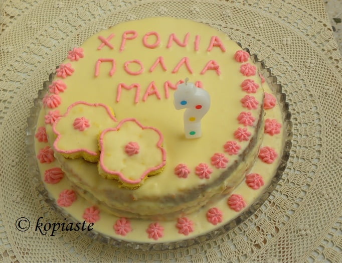 For frosting she made a white chocolate ganache and decorated it with some of the reserved whipped cream with cream cheese in which she added a drop of red food colouring.  The third sponge slice was used to cut two flowers with a cookie cutter which she decorated with the frosting and wrote Happy Birthday Mum in Greek.