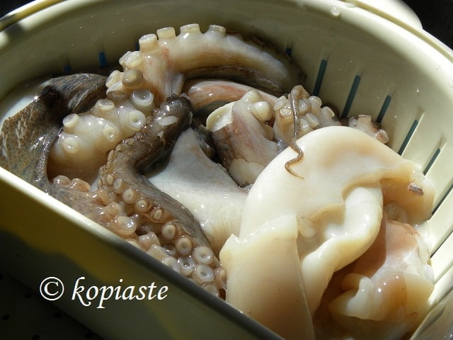 The octopus I bought was quite large.  I prepared the first step with the whole octopus and part of it was marinated in vinegar  and olive oil, which is preserved for many days and can be served with some oregano, as part of our meze dishes.