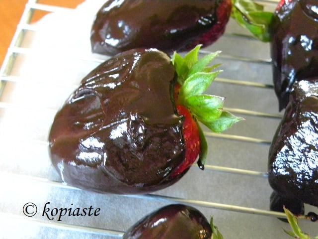 - Dip each strawberry into the chocolate and place on the rack.