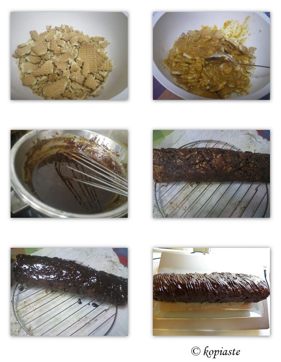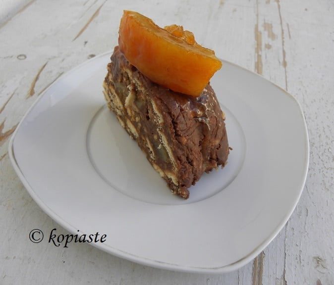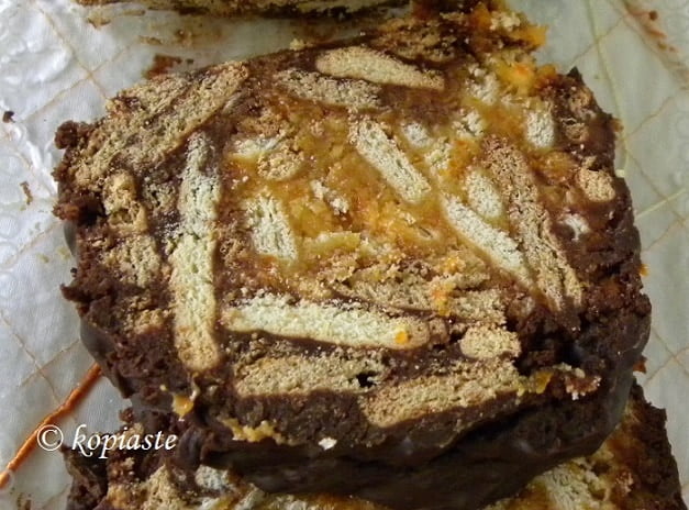 Kormos, also called mosaic or salami or “doukissa” (duchess cake), is a no bake, easy dessert with biscuits, which are bound together with a buttercream or melted chocolate.