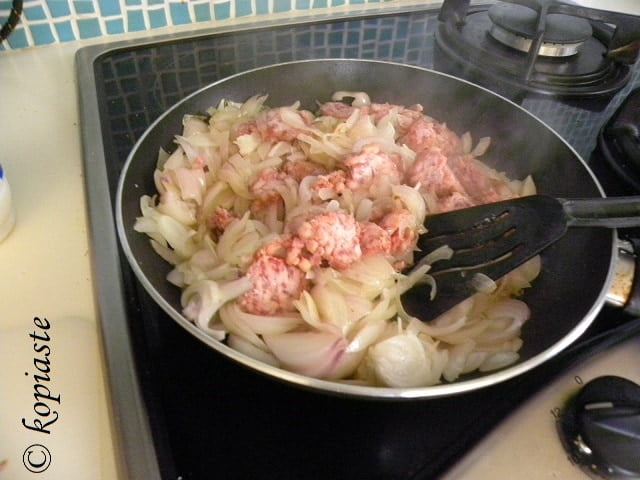 I did have some leftover grated gouda cheese and had some sausages from yesterday’s recipe Gemista me Loukanika (sausages), which were wrapped and stored in the deep freezer, as i did not anticipate to use them again soon.