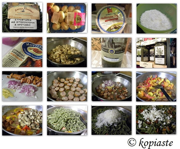 I made a peasant style recipe with some of the ingredients I bought and some given to me from the Grocery for the Mediterranean Diet. I used extra virgin olive oil, sausages, dried anthotyros, feta, mushrooms and bell peppers. To make the sauce, I made a roux and used white dry wine and cheese. I avoided to use heavy cream because the sausages and cheese are quite rich so I tried to keep the dish on the healthy side.