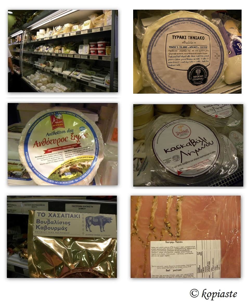 All kinds of selected Greek cheeses and gourmet charcuterie, such as buffalo kavourmas, beef pastrami, sausages, salami etc.