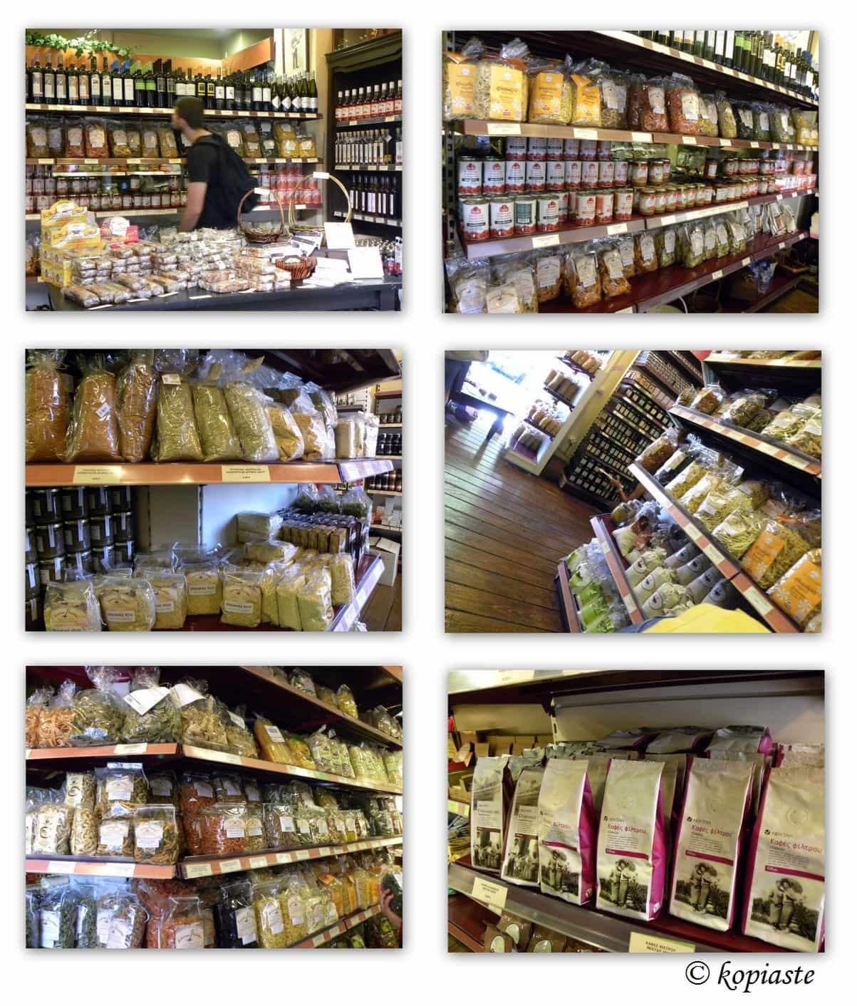 Endless brands of prime quality extra virgin olive oil, from all over Greece, which is surely the best in the whole world as well as prime quality vinegars, pasta with many types of flour and flavours, canned products from Santorini, such as their famous tomatoes, capers, legumes etc, dried figs and other products made with figs, halvas, pastelli (sesame-honey candy), carob products, grape molasses, blossom water etc.