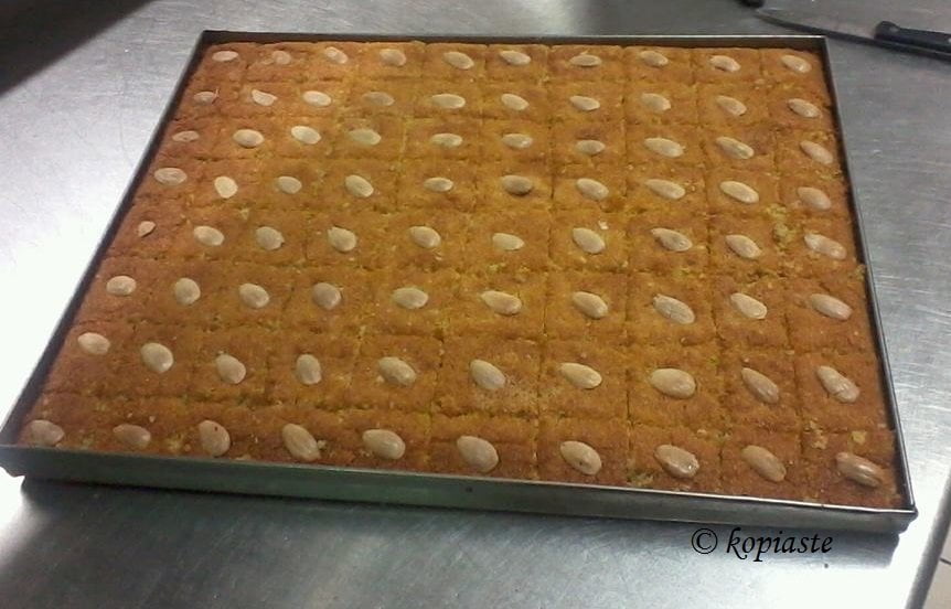 Samali is a traditional Greek semolina dessert, flavoured with mastic and drenched in syrup. Some blanched almonds are used to decorate the cake on top.