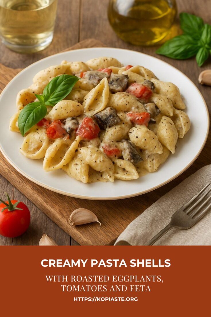 Creamy Pasta Shells with Roasted Eggplants, Tomatoes and Feta